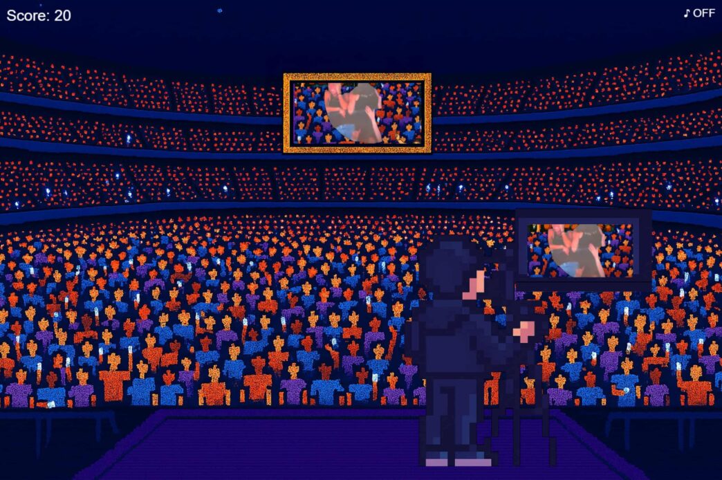 Como você pode ver na imagem abaixo, assim que você identificar o casal na plateia (no maior estilo “onde está Wally?”), basta clicar e segurar por 1 segundo para pontuar – e, na sequência, o casal estará em algum outro lugar da audiência. Trata-se de uma experiência bem simples, mas que serve para aproveitar o momento do assunto e brincar com o ocorrido.