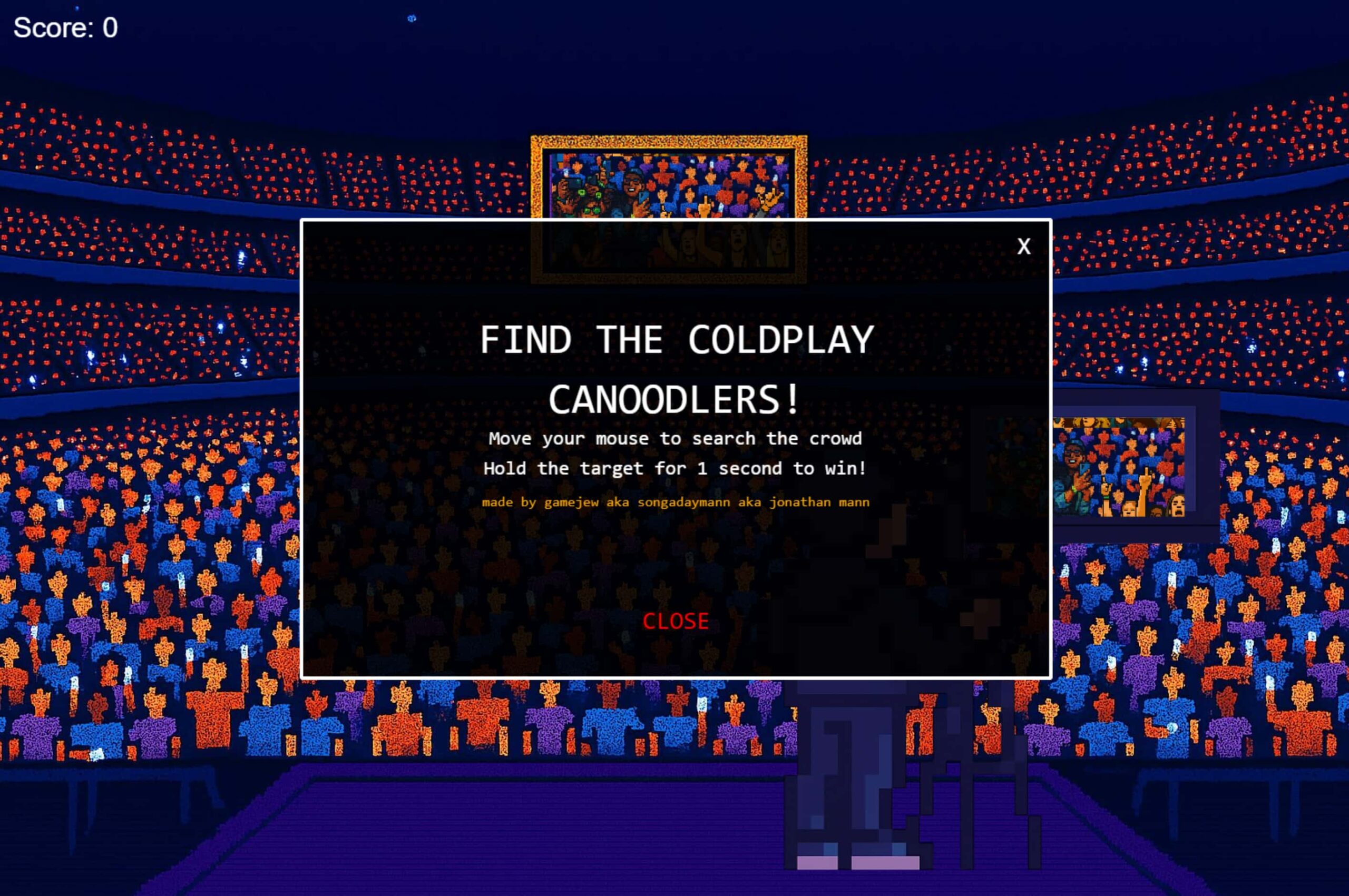 O mais curioso de Coldplay Canoodlers é que ele já está disponível para jogar, é totalmente gratuito e funciona diretamente no navegador de internet. No gameplay bem retrô em 16-bit, você deve vasculhar na multidão um casal apaixonado e colocar em destaque na câmera.