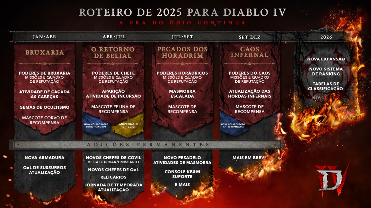 Hoje (8) a Blizzard divulgou um roadmap bem detalhado mostrando com detalhes tudo o que os jogadores podem esperar para cada trimestre, com direito até a uma palhinha de 2026. Confira a seguir.