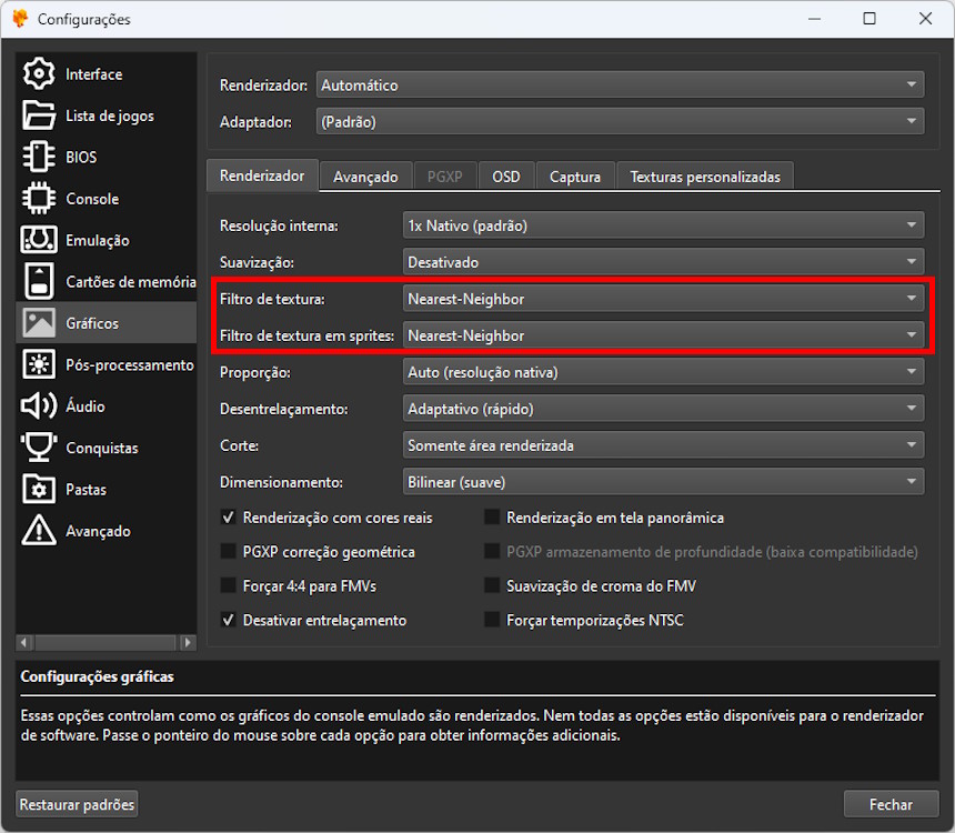 Caso você tenha ficado animado com a novidade, outra boa notícia é que este recurso do DuckStation pode ser testado agora mesmo. Para isso, após baixar o emulador do PlayStation 1, que vai sem BIOS e demais arquivos protegidos por direitos autorais, basta ir em “Configurações > Gráficos” e mexer nas opções que estão destacadas na imagem abaixo.