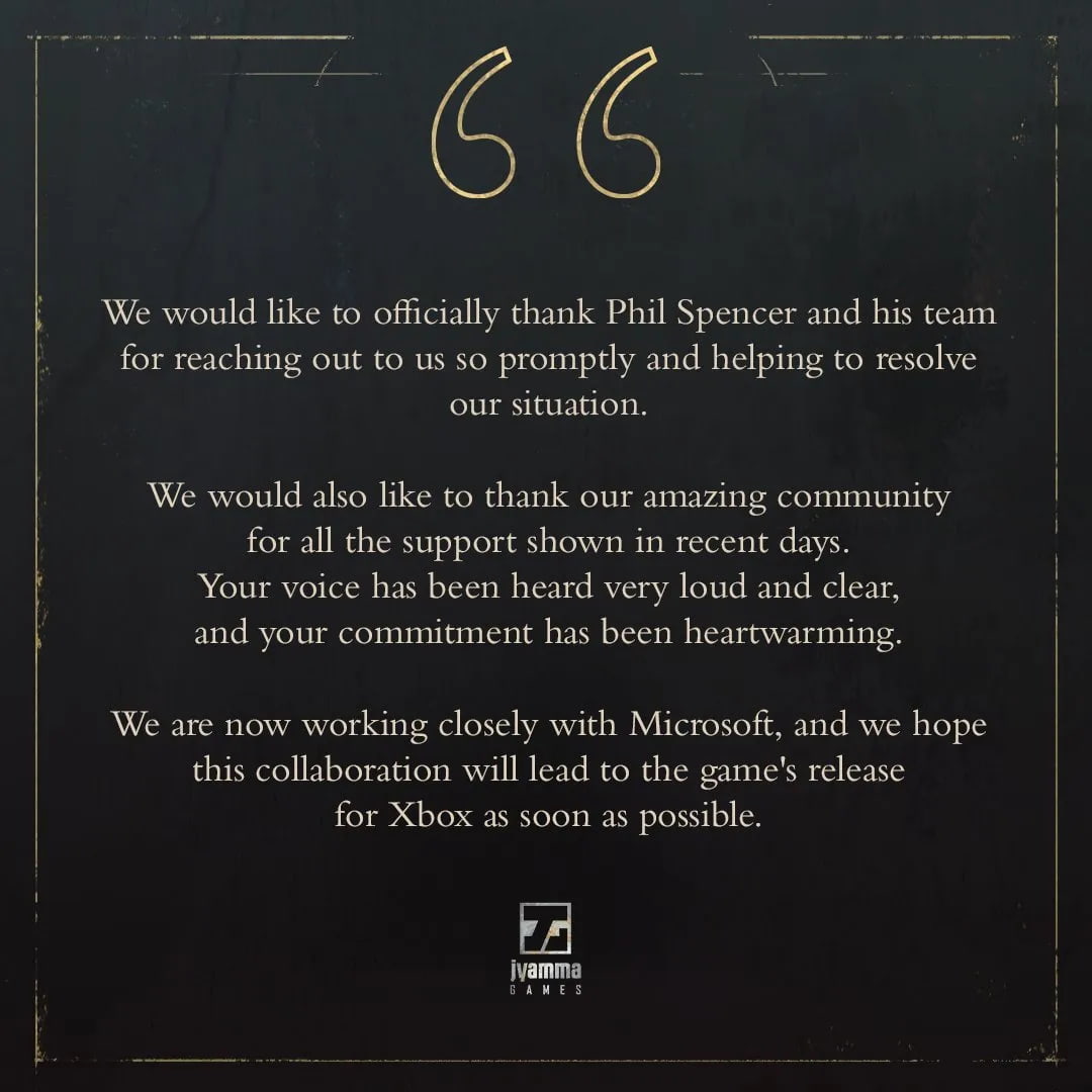 Em um comunicado publicado nas redes sociais nesta quarta (4), a Jyamma Games postou que Phil Spencer entrou em contato com a desenvolvedora e o processo voltou a funcionar. No post, lemos: