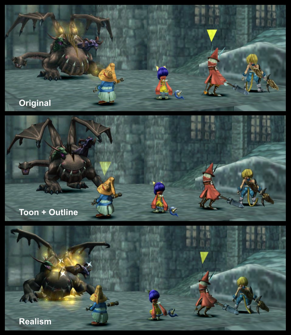 Outra novidade, ainda experimental do Moguri Mod 9.0, é a opção de colocar shaders nos personagens e monstros, como silhuetas cartoon ou “realistas”, que reagem à iluminação do cenário (particularmente, me parece muito destoante do resto dos visuais, mas fica a opção para quem quiser).