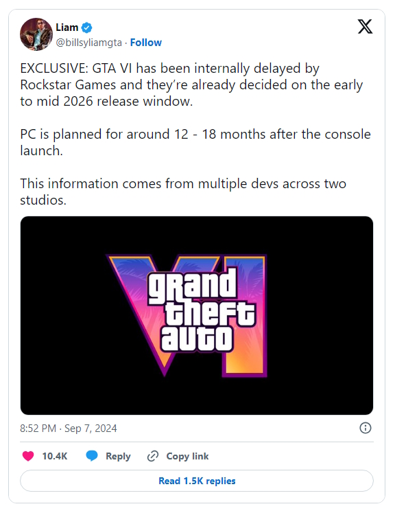 Segundo informações de Liam, do site GTA Base, publicadas no X, a Rockstar Games decidiu adiar o lançamento de GTA 6 para a primeira metade do ano de 2026. Além disso, ele também diz que a versão para PCs sairá após um ano ou um ano e meio após o título já estar disponível nos consoles.