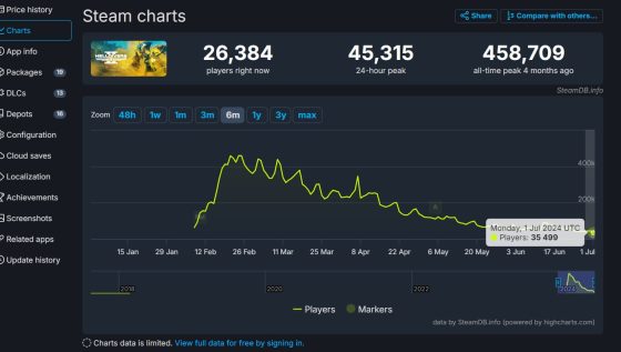 Recentemente, o site SteamDB registrou que Helldivers 2 (que teve um pico de 458 mil jogadores) está com uma média de 28 mil jogadores que, traduzindo, representa uma queda gigantesca no número de jogadores – ao menos na versão de PC. Mas seria isso um problema ou um ciclo de vida natural?