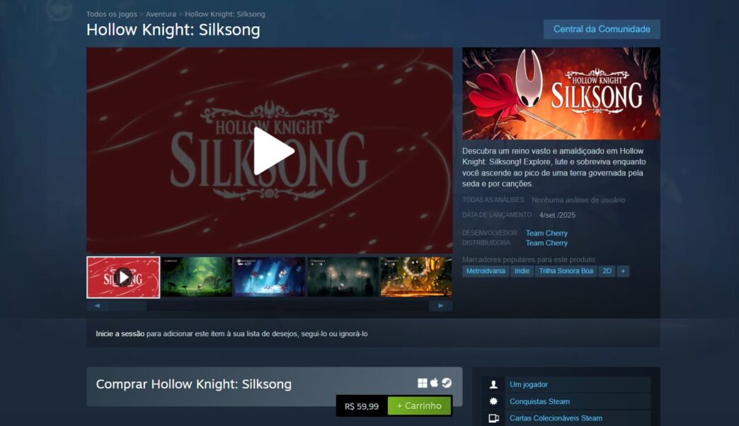 Hollow Knight Silksong é vendido a partir de R$ 60 no Brasil