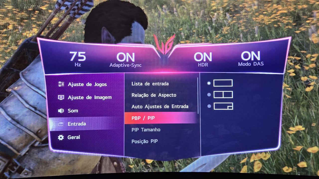 Além dessas funções mais específicas para jogos, o LG UltraGear OLED Curvo 45GS95QE traz algumas configurações já prontas para o PiP ou PBP, que permite usar imagens de duas fontes diferentes.