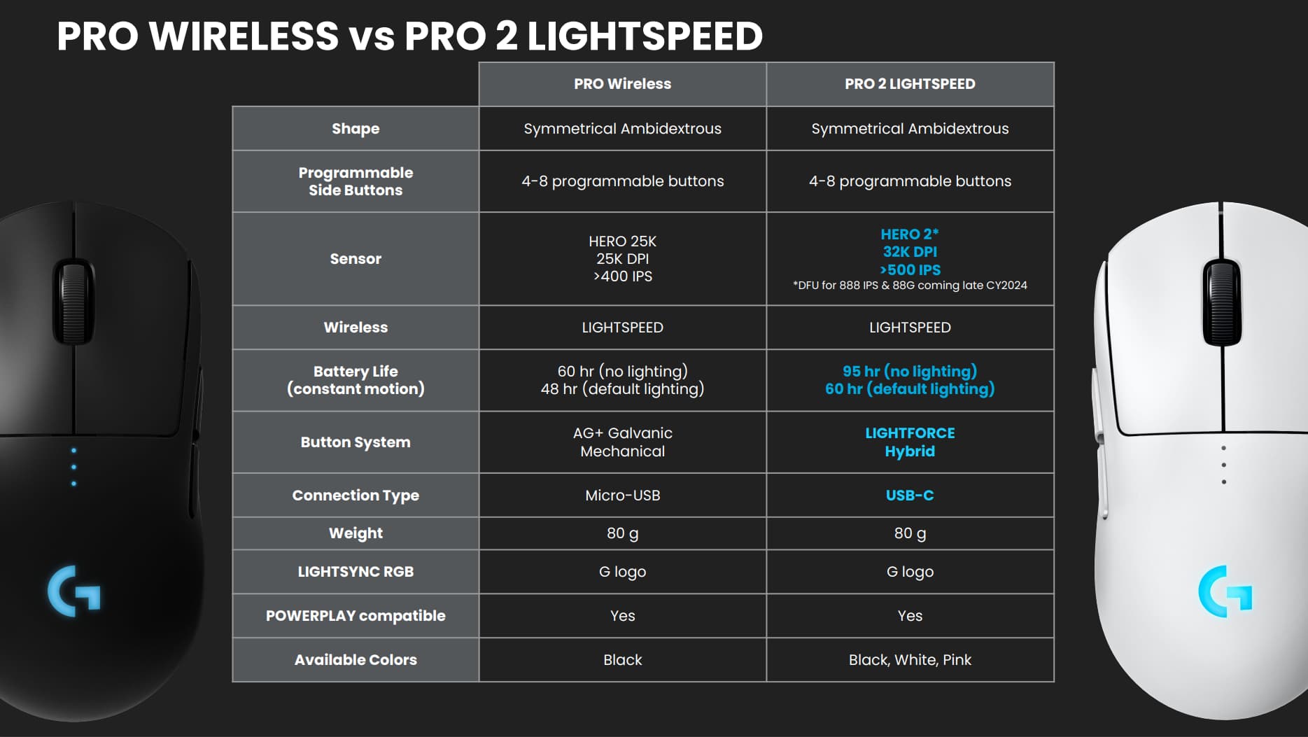 Segundo a companhia, o novo mouse foi construído com a ajuda de proplayers ao redor do mundo e passou por múltiplos designs até ser aprovado pelos jogadores de elite do segmento de esports. No total, são 2 modelos: Pro 2 Lightspeed, com iluminação RGB, mais pesado (cerca de 80g) e feito para ambidestros, e o Pro X Superlight 2, sem RGB, com 60g e em duas variantes, uma com design simétrico e outra assimétrico (mas ambas para destros).