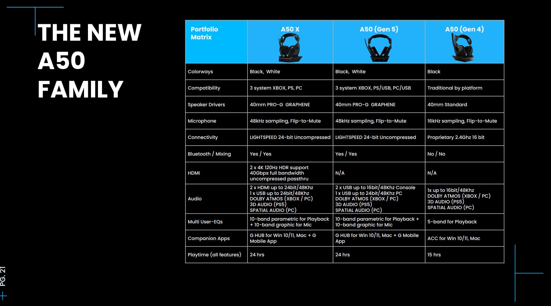 Por fim, a linha Astro A50, o headset topo de linha da Logitech, também chega à sua 5ª geração com algumas funcionalidades mais parrudas, drivers de áudio PRO-G de grafeno de 40 mm aprimorados (em outras palavras, qualidade de áudio melhor), suporte para 3 sistemas diferentes que podem ser conectados simultaneamente (Xbox, PlayStation e PC, que podem ser alterados na base de carregamento) e mais.