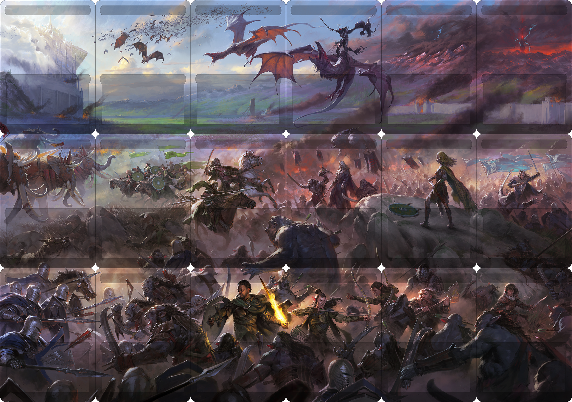 Uma delas é a Batalha dos Campos de Pelennor, o épico confronto entre as tropas de Mordor (com os orcs, Nazgûl, olifantes e os haradrim), as defesas de Gondor e a investida da cavalaria de Rohan, com 18 cartas compondo esta cena específica. Infelizmente, não temos acesso às demais artes, mas pode esperar escalas épicas.
