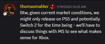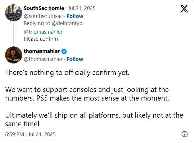E o Xbox? “Teremos que conversar com a Microsoft para ver o que faz sentido para o Xbox”, disse Mahler no Discord. No Twitter, o CEO explicou que não há nada oficializado no momento, mas que olhando pela perspectiva de números, o PS5 deve ser a prioridade. Ou, em outras palavras, ele deve ser o primeiro console a receber o game (o título deve ter lançamentos em diferentes momentos para cada videogame).