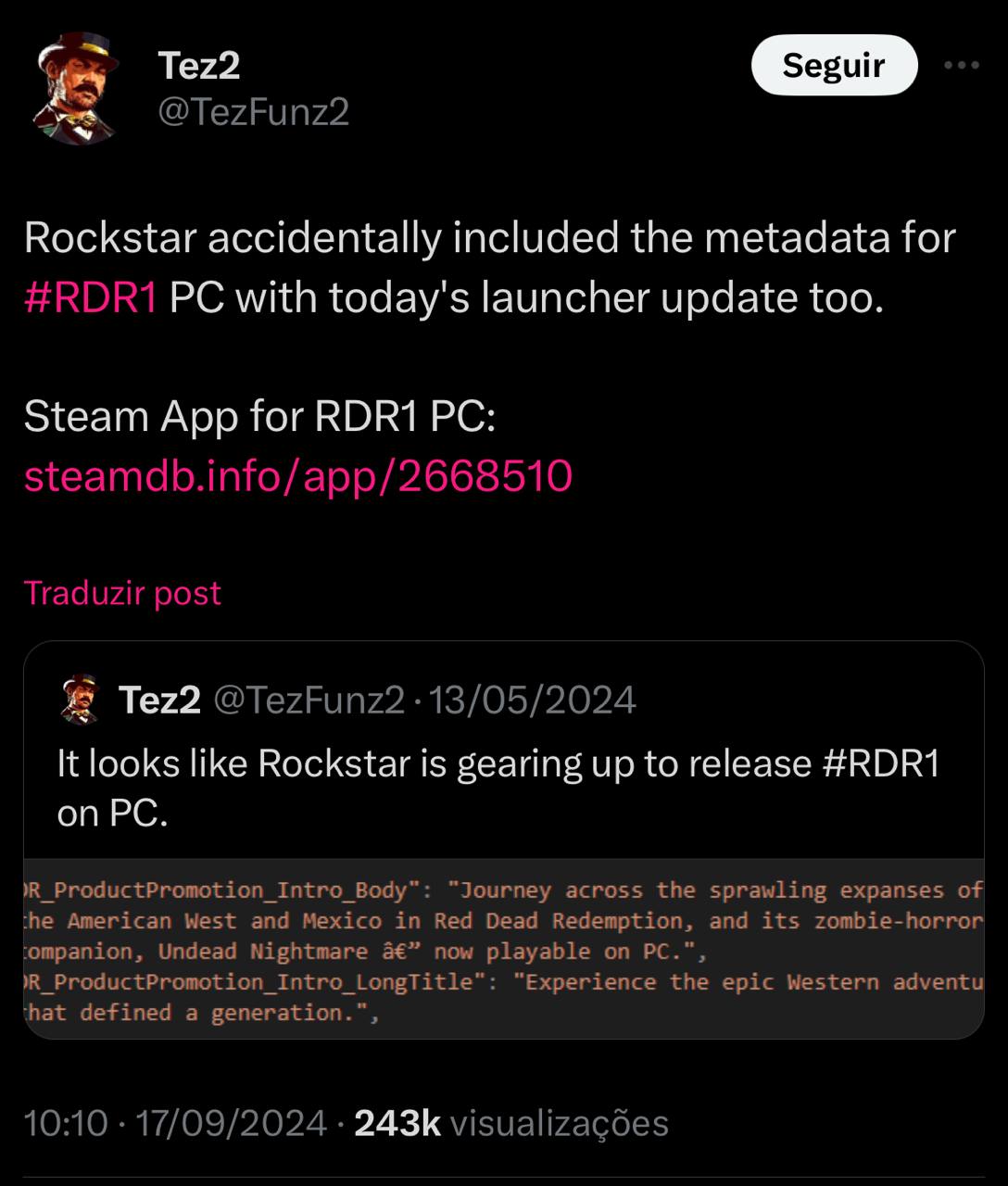 Segundo apurado por alguns dataminers, Red Dead Redemption já tem menções de metadata no launcher da Rockstar no PC, além de ter aparecido na base de dados da Steam. Será que após chegar ao PS4 e Switch, finalmente o game vai dar as caras no PC?