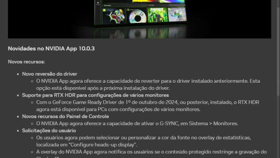 Entretanto, essa não é a única novidade, já que a companhia também atualizou o NVIDIA App e trouxe melhorias. Entre elas está a opção de reverter os drivers para uma versão anterior, suporte para RTX HDR em múltiplos monitores, facilidade maior para ativar o G-SYNC no aplicativo, personalização de cores na fonte do overlay e mais.