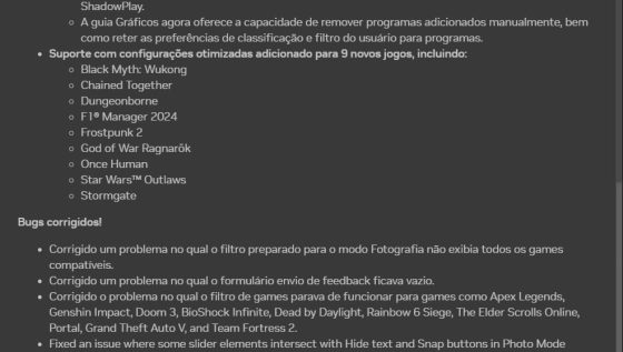 Além disso, como você confere na imagem acima, alguns bugs no aplicativo e na execução de certos jogos também foram corrigidos. Portanto, se você tem uma GPU NVIDIA, não deixe de atualizar seus drivers e o aplicativo!