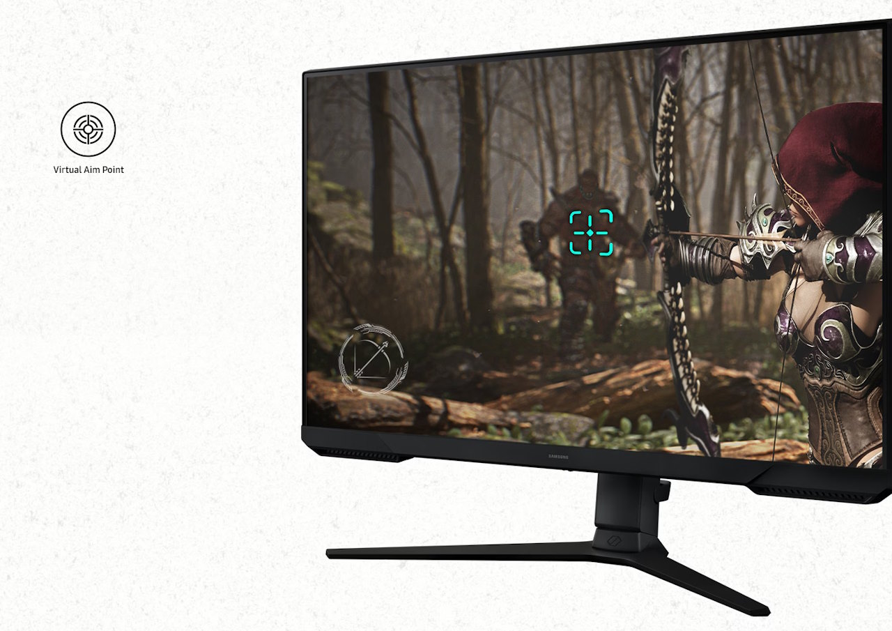 Assim como outros monitores gamers mais atuais, o Odyssey G3 também conta com a função Virtual Aim Point. Quando ativada, ela basicamente adicionar uma mira fixa em jogos de tiro para que o jogador consiga acertar o seu alvo com mais facilidade.