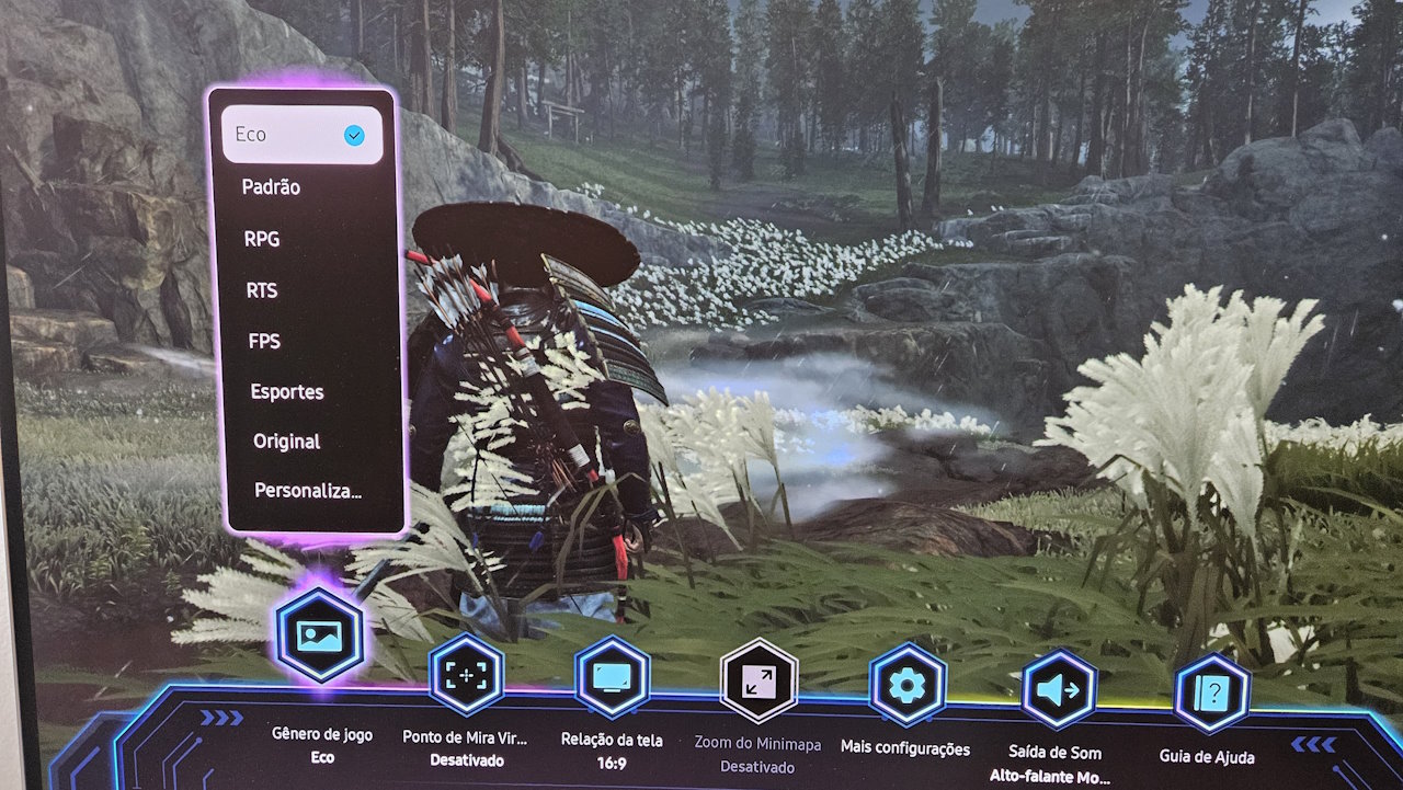 Para o uso mais gamer, o Odyssey OLED G8 vem com alguns recursos extras, que podem ser bem interessantes. A maioria deles pode ser acessado por um menu simples e eficaz, que pode ser exibido ao segurar o botão “play” do controle remoto.