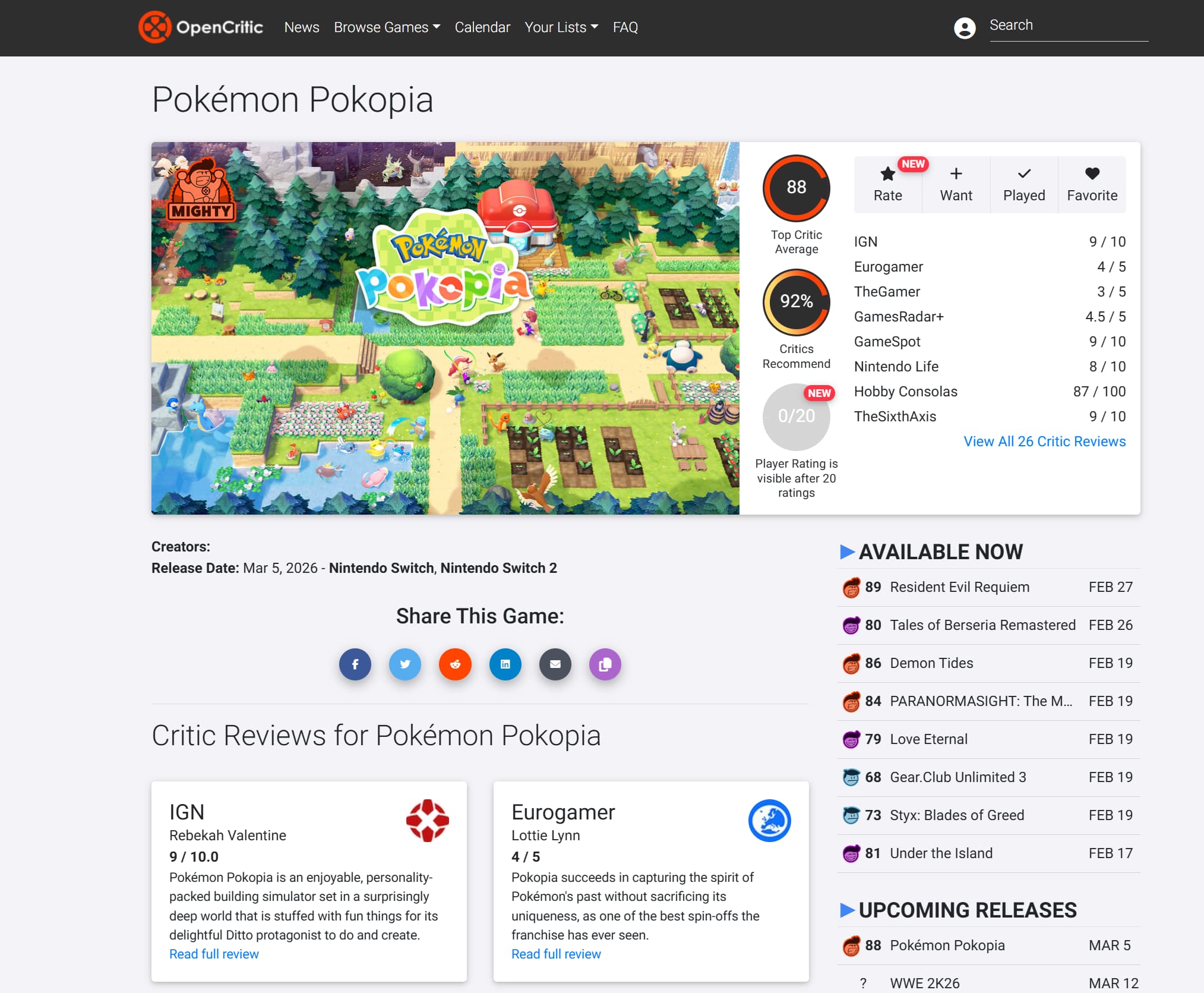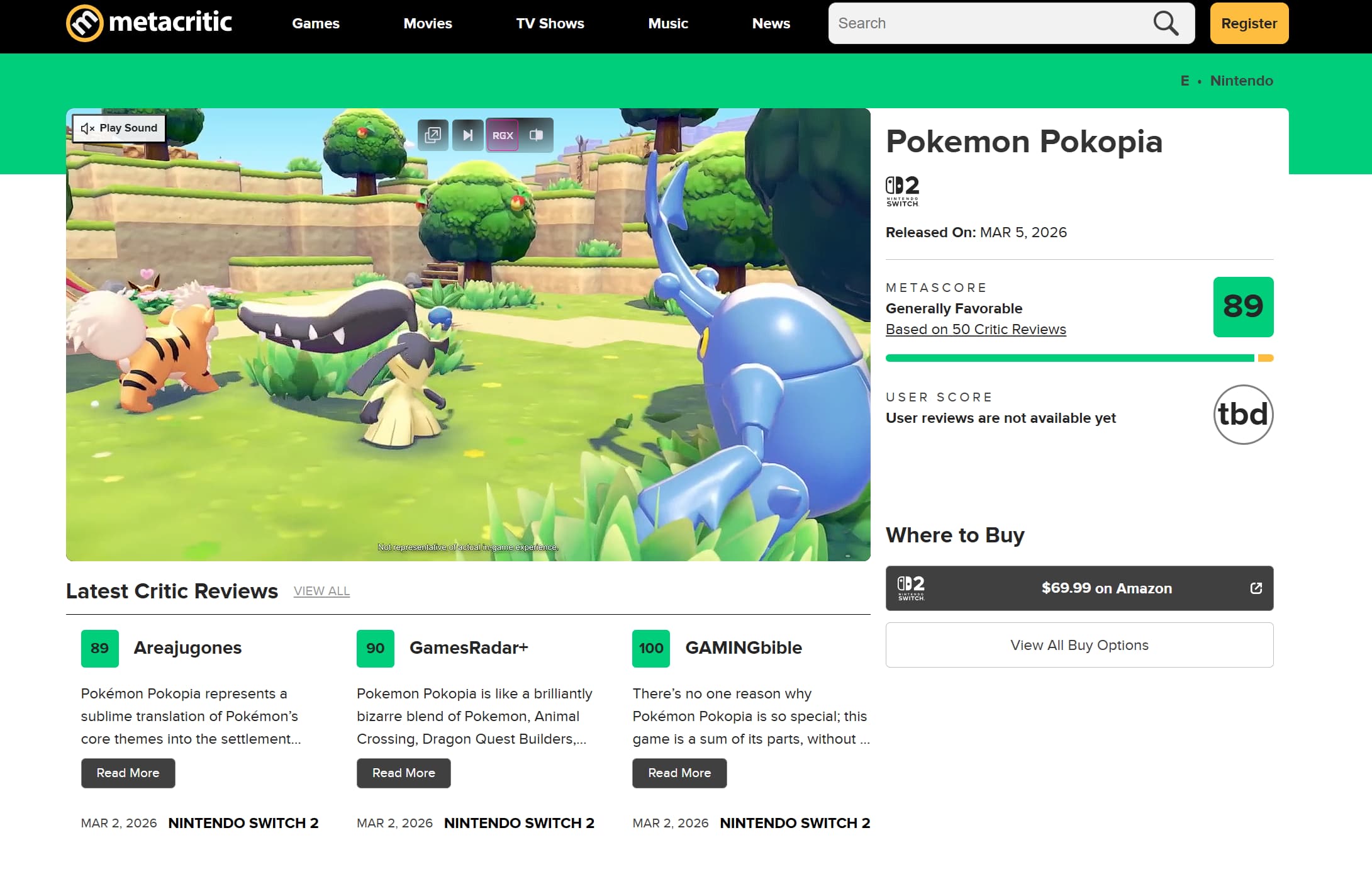 Se você pesquisar pela franquia no Metacritic, verá que abaixo de Pokémon Pokopia temos Pokémon Y com 88 pontos, mas todos os outros, como HeartGold/SoulSilver, LeafGreen/FireRed, Black/White e mais têm notas menores.