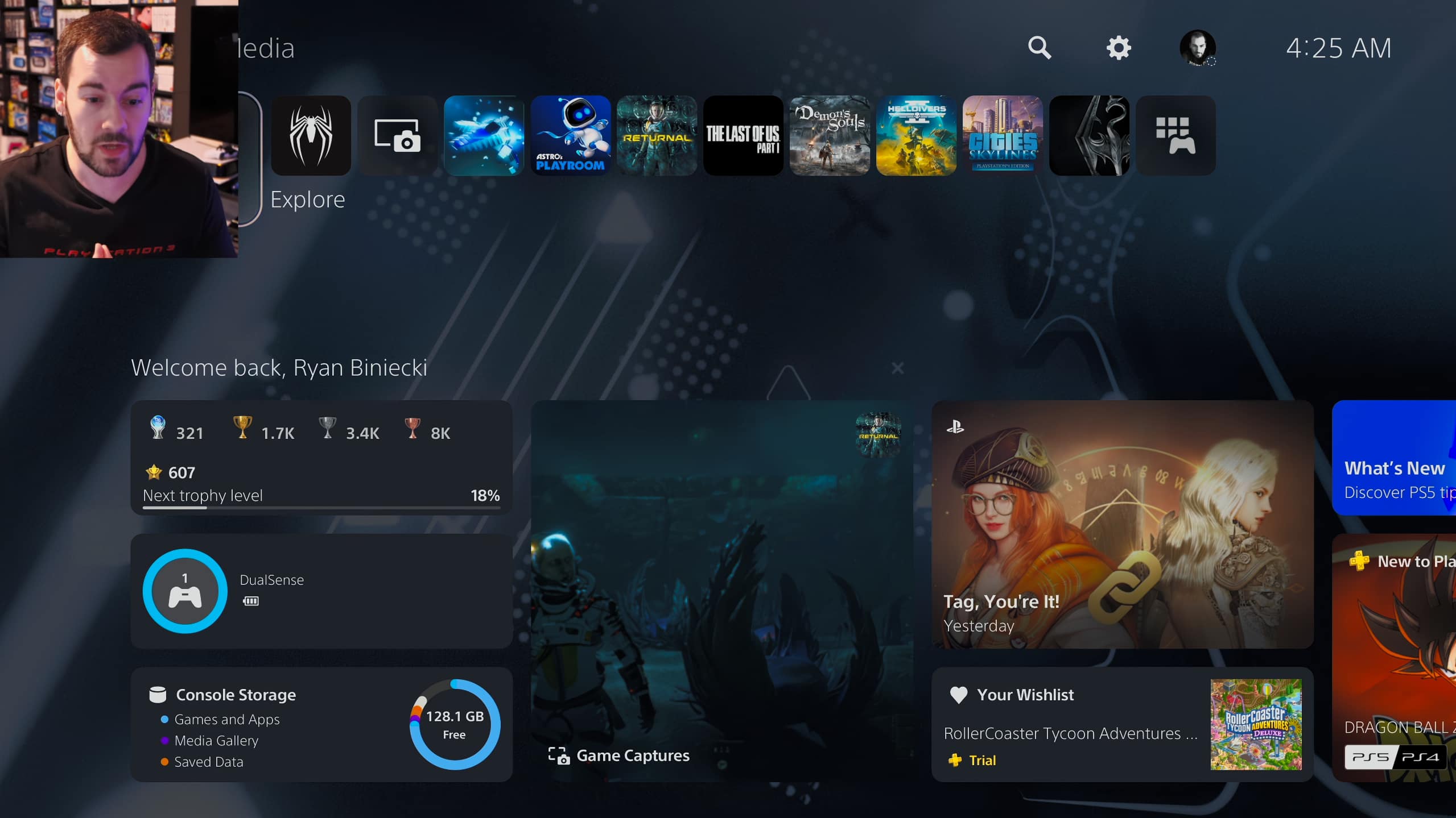 Como vemos no vídeo, o menu Explorar do PS5 agora mostra o espaço disponível em disco, as suas últimas capturas, nível de bateria do controle DualSense e headset Pulse e mais, como jogos da lista de desejos em promoção, novidades que possam interessar etc.