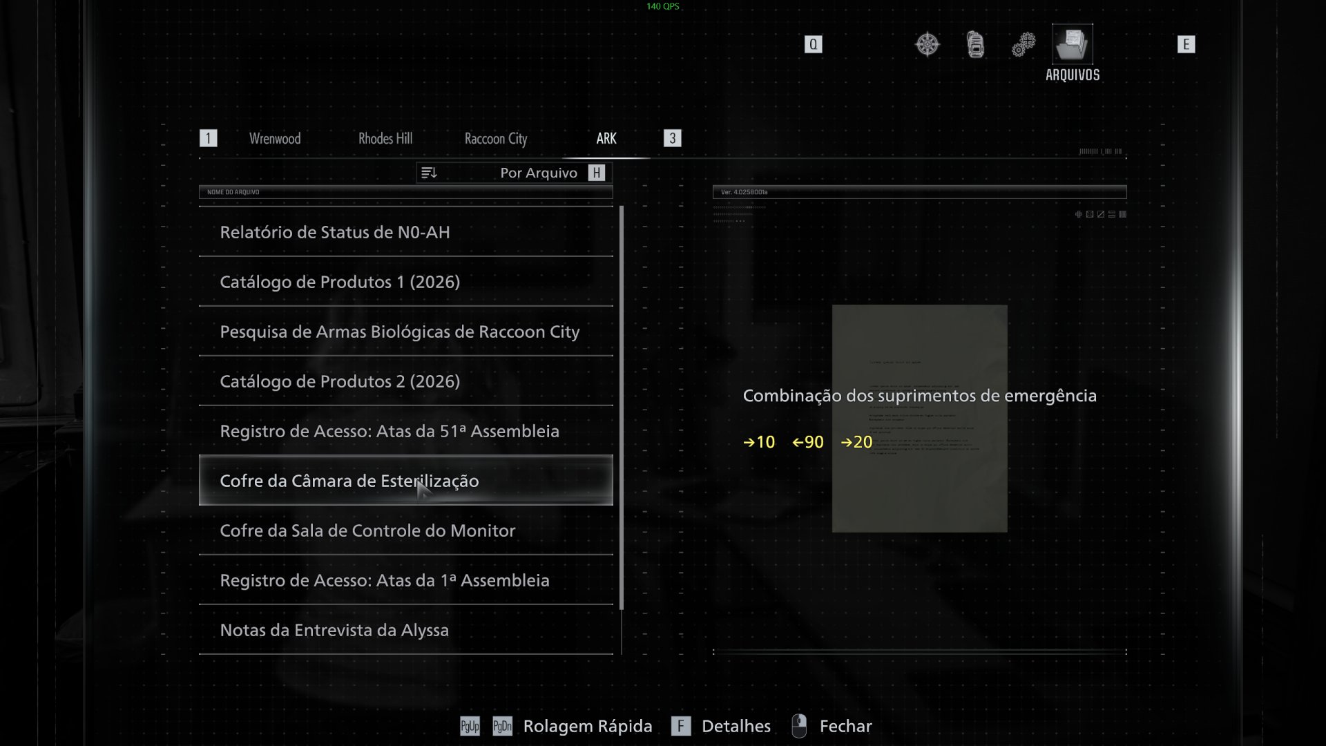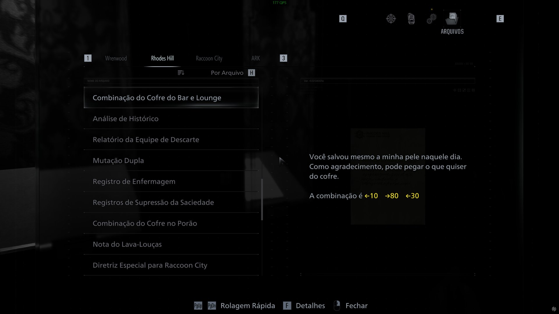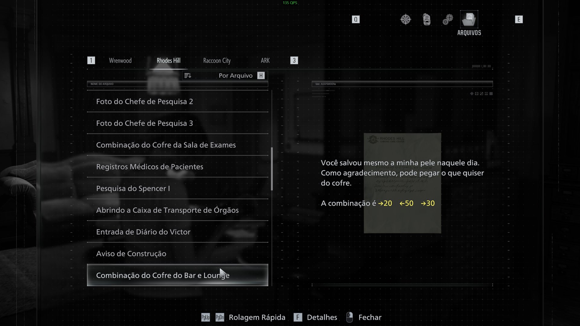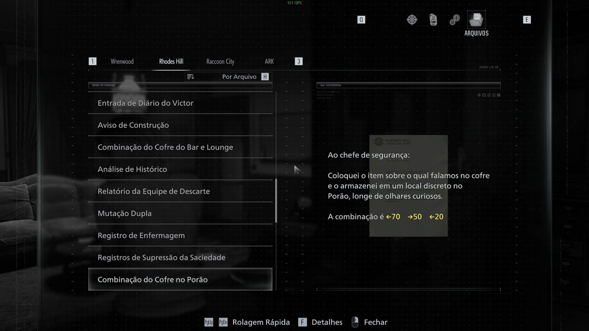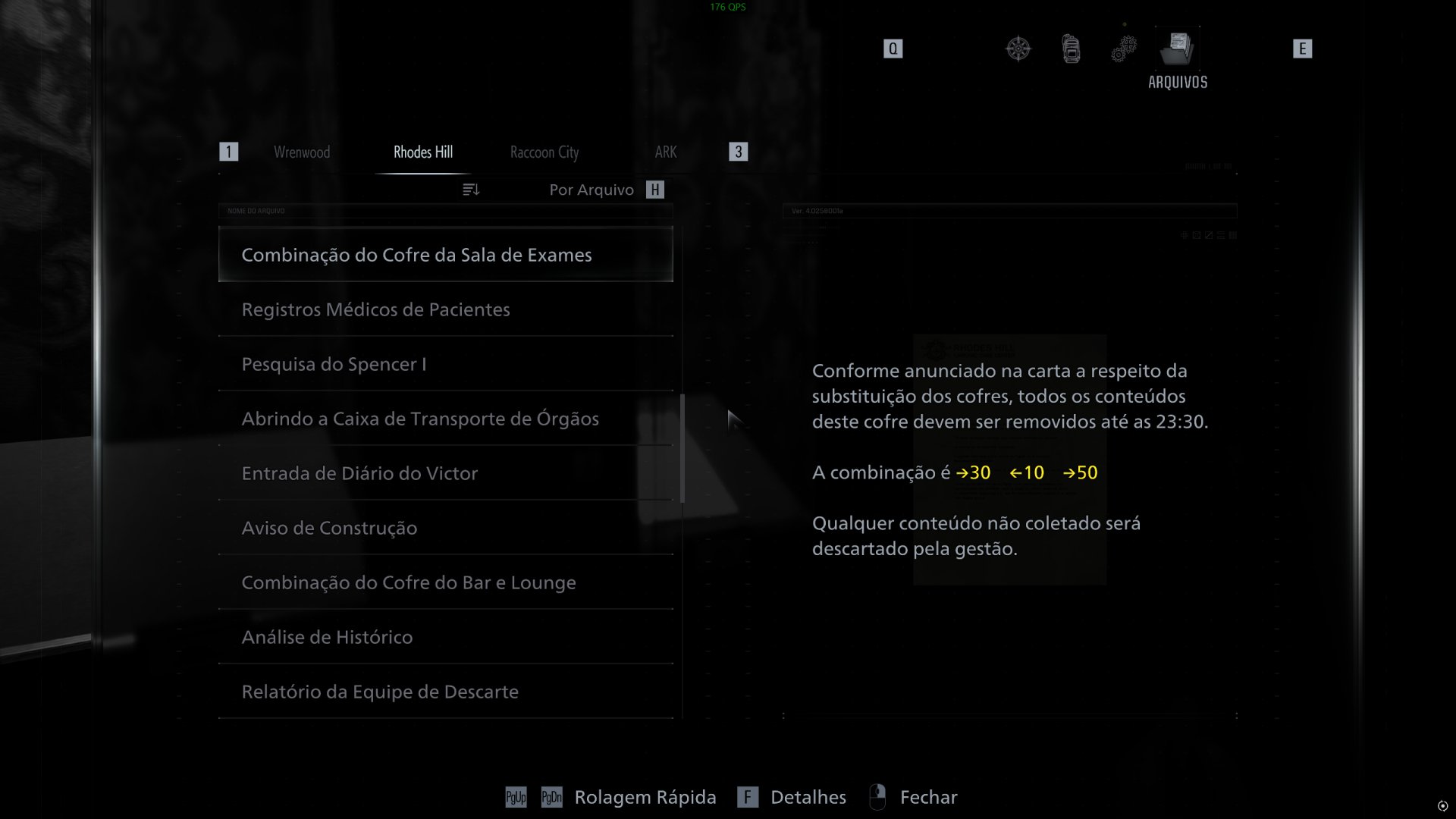 Caso essa seja a sua primeira vez jogando da dificuldade Insano, você vai notar que os arquivos contendo as senhas dos cofres da Rhodes Hill Care Center e laboratório ARK sumiram. Basicamente, as senhas são diferentes e você confere abaixo: