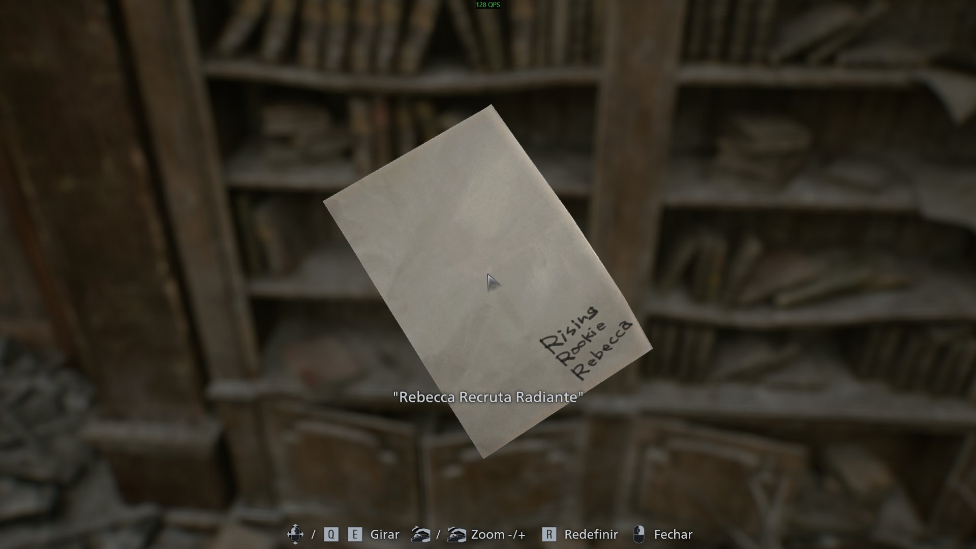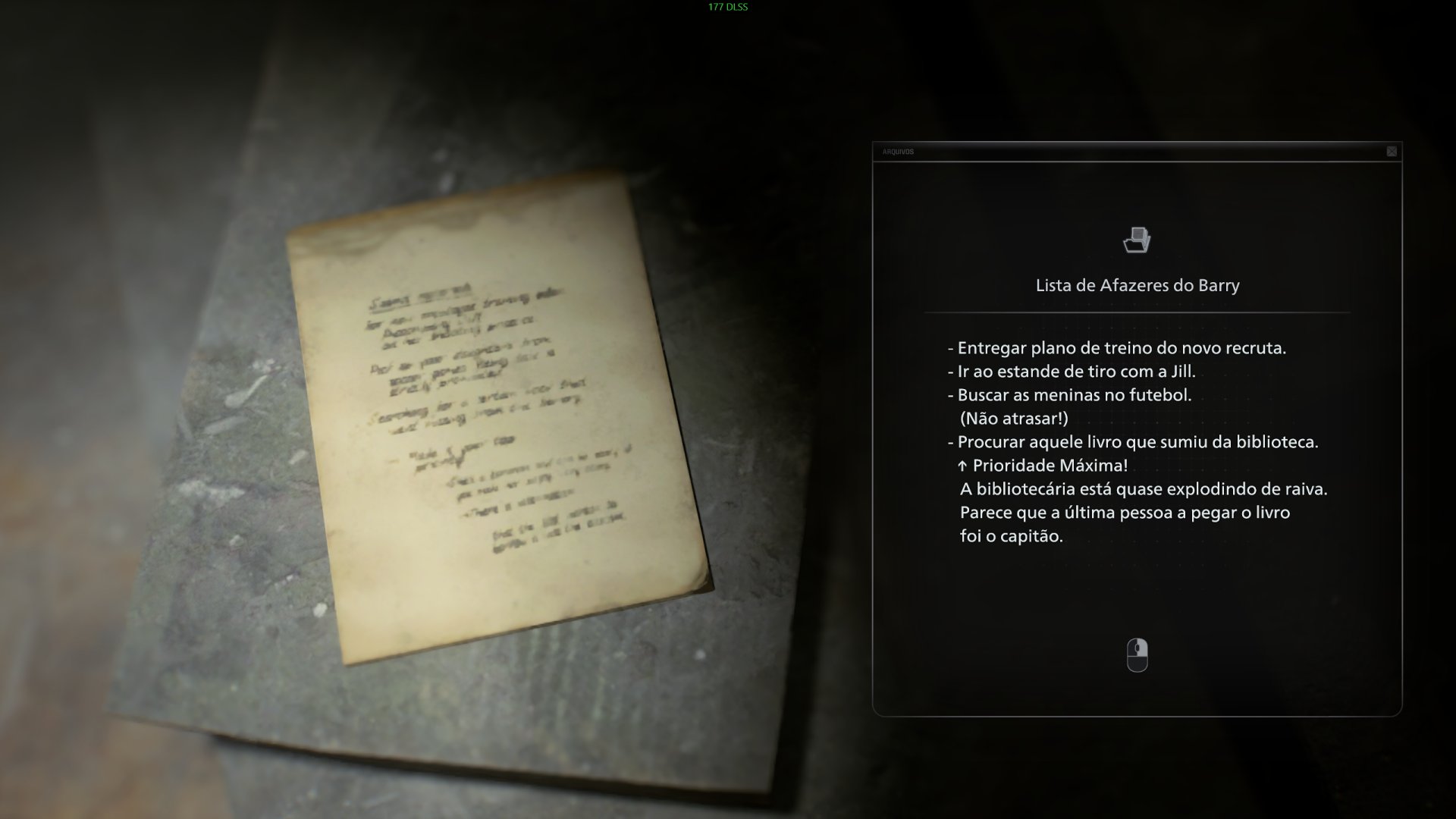 No original, víamos uma foto de Rebecca Chambers, mas em Resident Evil Requiem é um canhoto da biblioteca. Somente após encontrar esse documento, você pode subir ao segundo andar da biblioteca e interagir com o livro “Medicinal Benefits of Herbs”.
