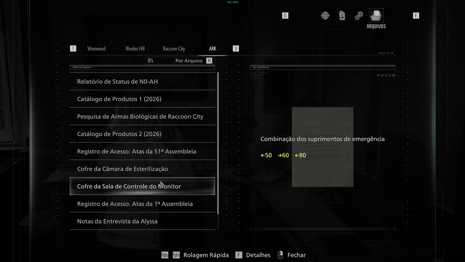 - Cofre da Sala de Controle de Monitor: <- 50, -> 60, <- 80