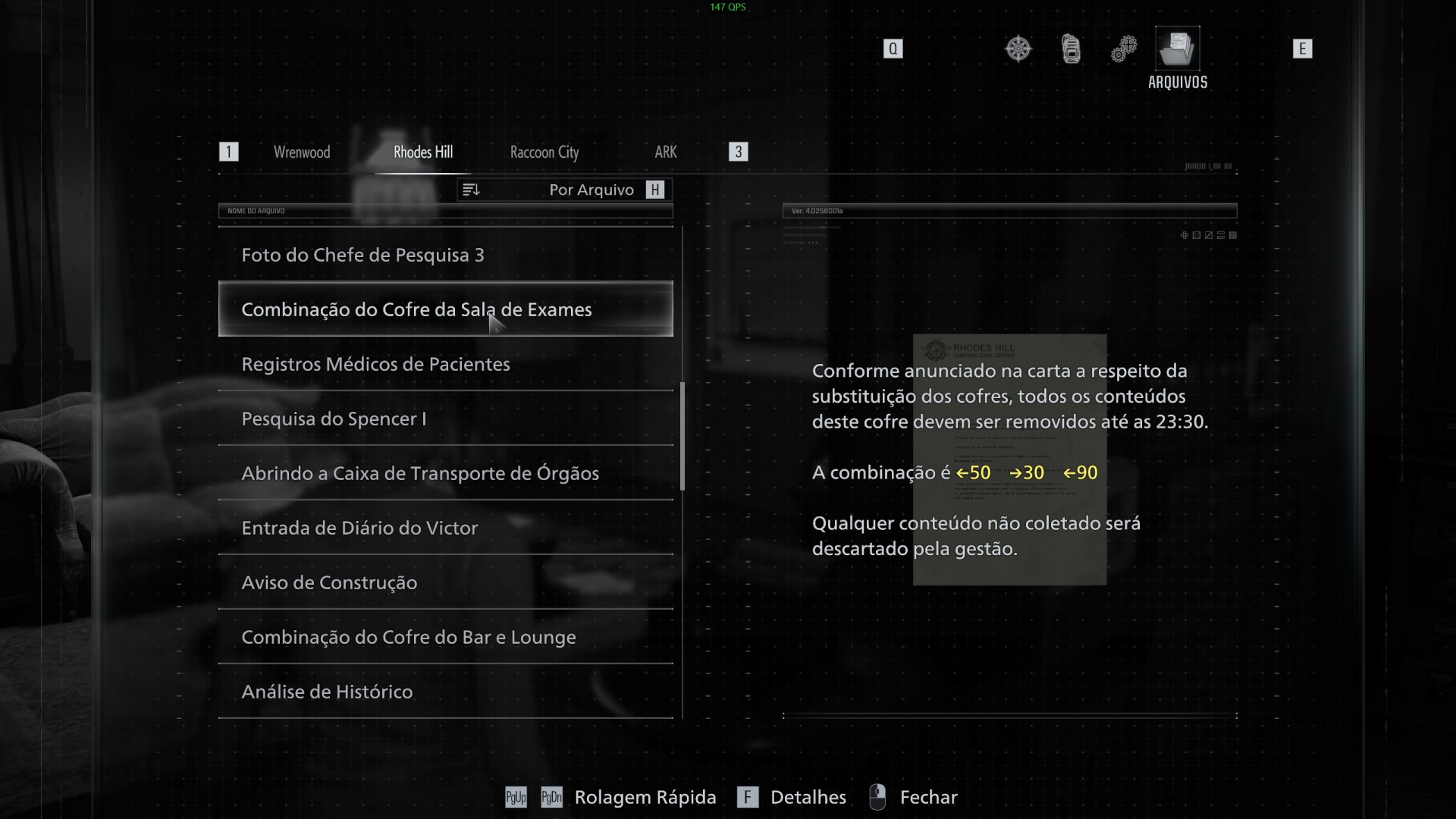 - Cofre da sala de exames: <- 50, -> 30, <- 90