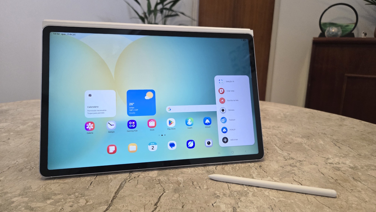 O destaque mesmo, entretanto, fica com a S-Pen, que marca presença no kit do Galaxy Tab S10 FE+. Ela pode ser utilizada para notas, desenhos e até recortes de itens para buscar sobre algo que está sendo visto na tela.