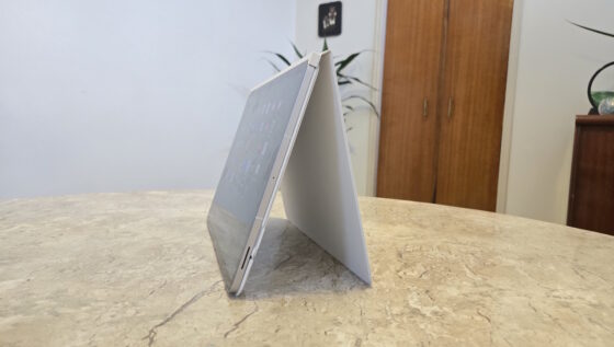 A capa origami ajuda um pouco em deixar ele de pé, não dando uma sustentação perfeita, porém, um pouco melhor do que a demonstrada nas fotos do Review.