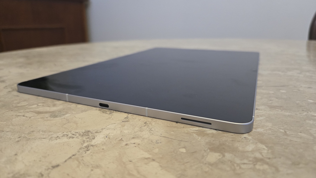 Algo importante em que a Samsung acerta é que, mesmo sendo um tablet grande, o Galaxy Tab S10 FE+ não é grosso. A sua espessura é de somente 9 mm e as bordas ao redor da tela são mínimas. Não somente isso, o seu peso na casa das 660 g faz com que seu transporte seja fácil.