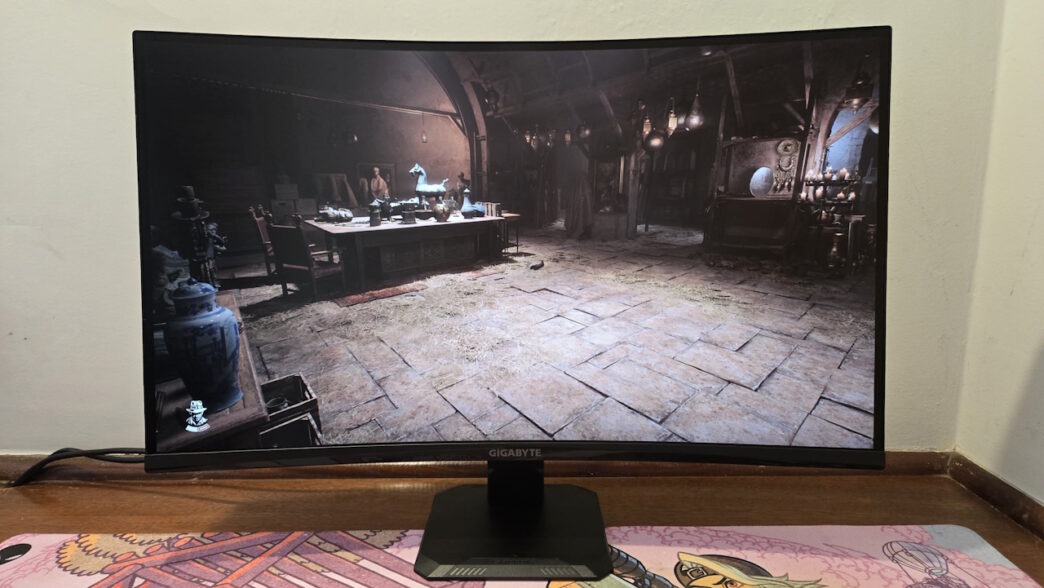 A curvatura com o raio 1500R do Gigabyte GS27QC é algo que facilitou o meu ângulo de visão neste modelo, evitando aqueles movimentos bruscos de olhar para o lado para enxergar algo. Apesar disso, o ângulo de visão para quem não está de frente para o monitor é um pouco prejudicado.
