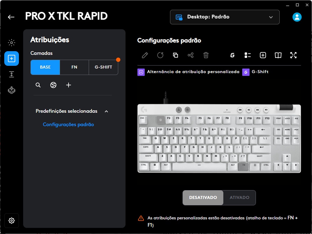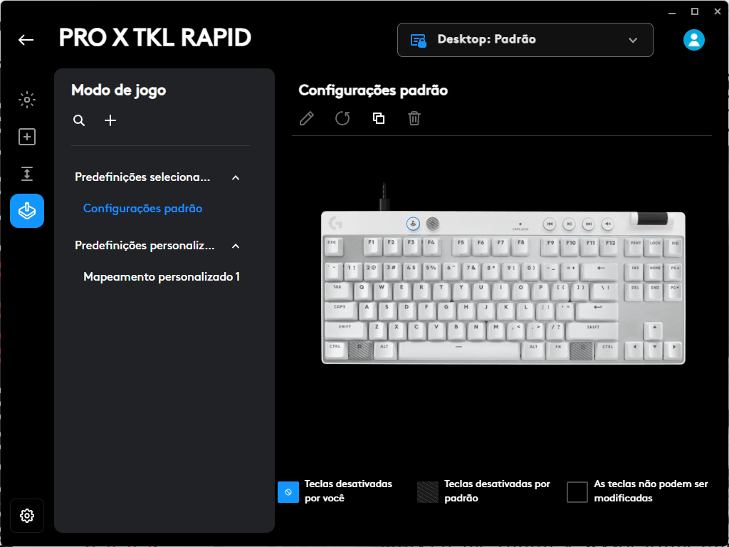 Por último, o software para controlar o Logitech G PRO X TKL RAPID ainda traz uma seção para ativar ou desativar o Modo de Jogo. Quando este modo está ativado, apenas as teclas definidas pelo jogador funcionarão durante uma partida.