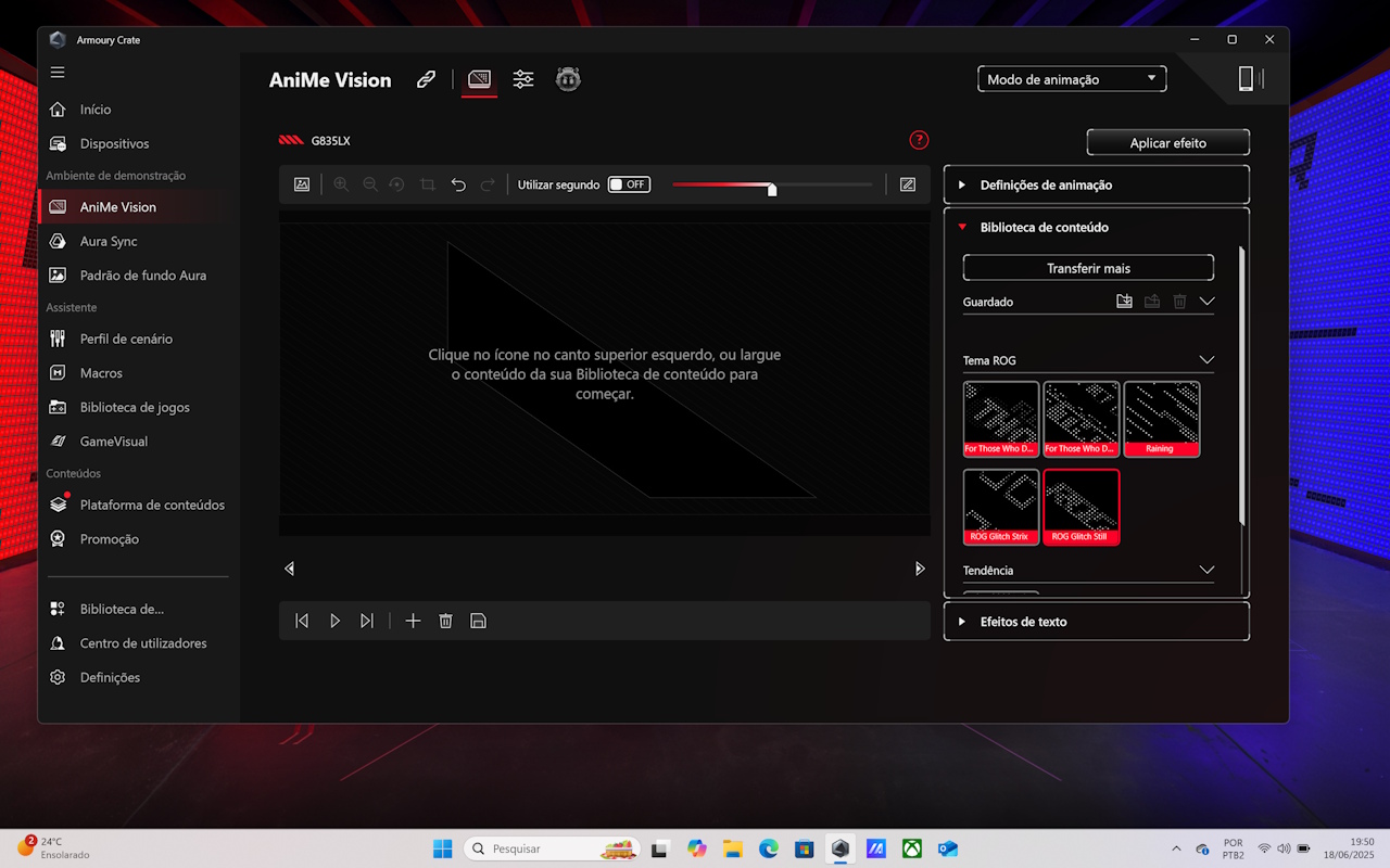 A parte de LED da tampa traseira do ROG Strix Scar 18 pode ser personalizada na parte AniMe Vision. Nessa parte, inclusive, a ASUS acertou em cheio ao permitir que qualquer mudança seja aplicada rapidamente. Por exemplo, é possível usar arquivos de imagens para serem exibidos.