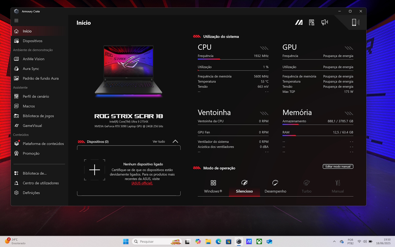 Para configurar as principais funções do ROG Strix Scar 18, assim como em outros notebooks da ASUS, o software a ser utilizado é o Armoury Crate. Logo em sua tela inicial já é possível verificar qual é o hardware do notebook e alterar o modo de operação, que pode focar oi hardware para mais desempenho ou em uma experiência silenciosa.