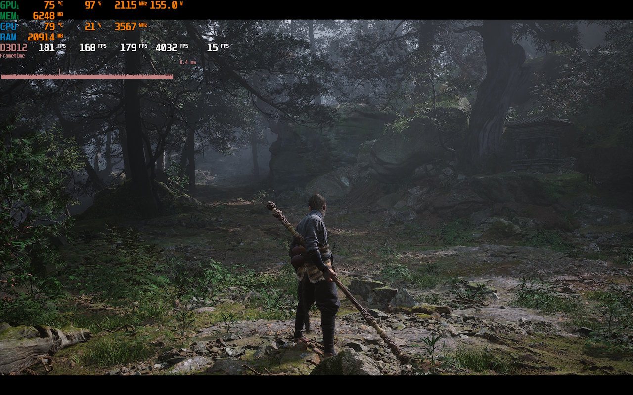 No Black Myth Wukong com a qualidade cinema e Ray Tracing completo no alto, a média foi de 80 FPS, mas era possível ver alguns artefatos. Com as configurações no alto e sem Ray Tracing, a média chegou a bater mais de 180 FPS. Infelizmente, por algum motivo, o monitoramento do frametime nele apresentou gráficos esquisitos.