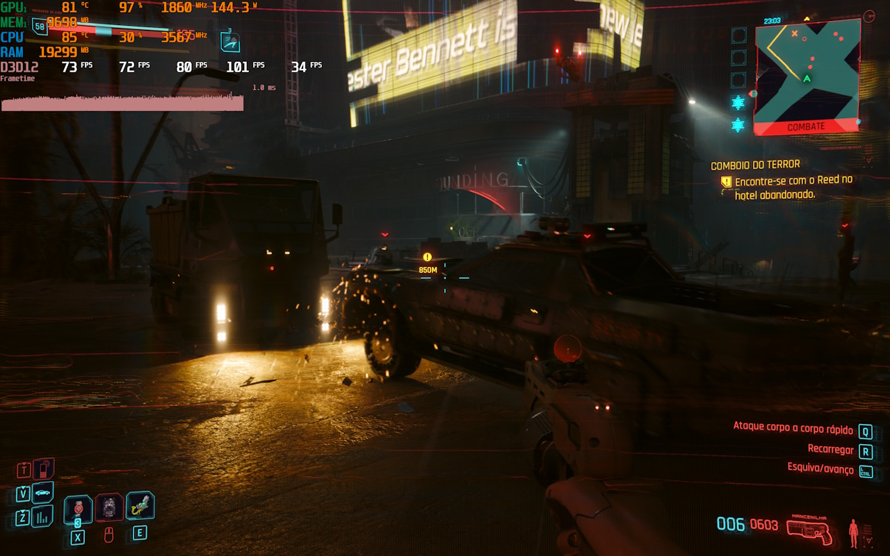 No último teste em Cyberpunk 2077 com o preset RT Overdrive, DLSS Qualidade e a geração de quadros ativada, a média é de 80 FPS. Sem a geração de quadros em 2X, a médica cai para 50 FPS.