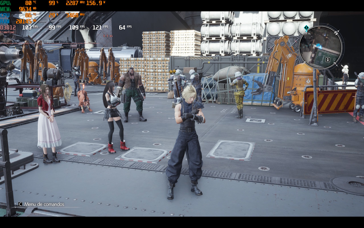 No Final Fantasy 7 Rebirth com tudo máximo em 1440p, incluindo as resoluções de escala mínima e máxima em 100%, o ASUS ROG Strix Scar entregou uma média de 110 FPS. O notebook até chega a alcançar 120 FPS em alguns momentos e quedas para os 97 FPS, mas a performance é bem fluída e sem stutterings. O jogo não traz suporte para a geração de quadros.