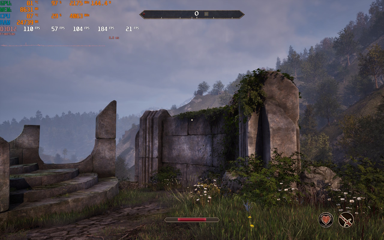 Todos os resultados foram monitorados com o MSI Afterburner, mas vale notar que o gráfico do frametime, em alguns casos, não estava sendo apresentado corretamente e não reflete a experiência que tive ao jogar. Dito isso e sem mais delongas, veja os resultados dos testes: