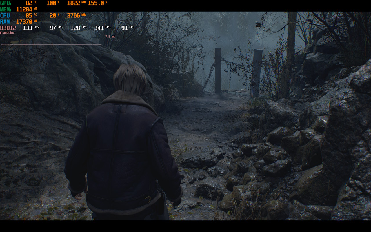 O Resident Evil 4 rodou com todas as configurações gráficas no máximo com uma média de 124 FPS estáveis. A resolução utilizada foi a nativa do notebook, sendo que o jogo não traz suporte ao DLSS. O FSR também não foi ativado durante os testes, uma vez que a média alcança de FPS estava excelente.