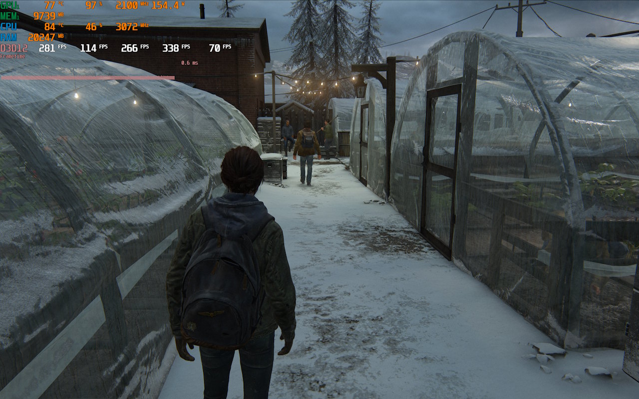 Em The Last of Us Parte 2 sem a geração de quadros e com tudo no máximo, a média registrada foi de 80 FPS, mas com algumas ressalvas. Nas partes em que o shader ainda não estava compilado quedas eram vistas até os 60 FPS. Ao ativar a geração de quadros com o DLSS no modo qualidade, a média foi de 235 FPS e os stutterings quase não eram notados.