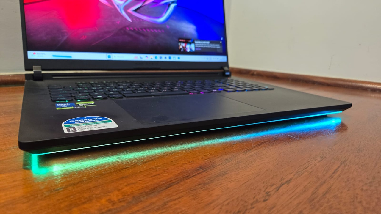Também em sua parte inferior, o ROG Strix Scar 18 traz uma iluminação RGB 360, que pode até ser considerada forte. Para aqueles que gostam de mais discrição, tanto essa iluminação RGB quanto a parte do LED de sua tampa podem ser desativadas e o notebook conta com um modo stealth.