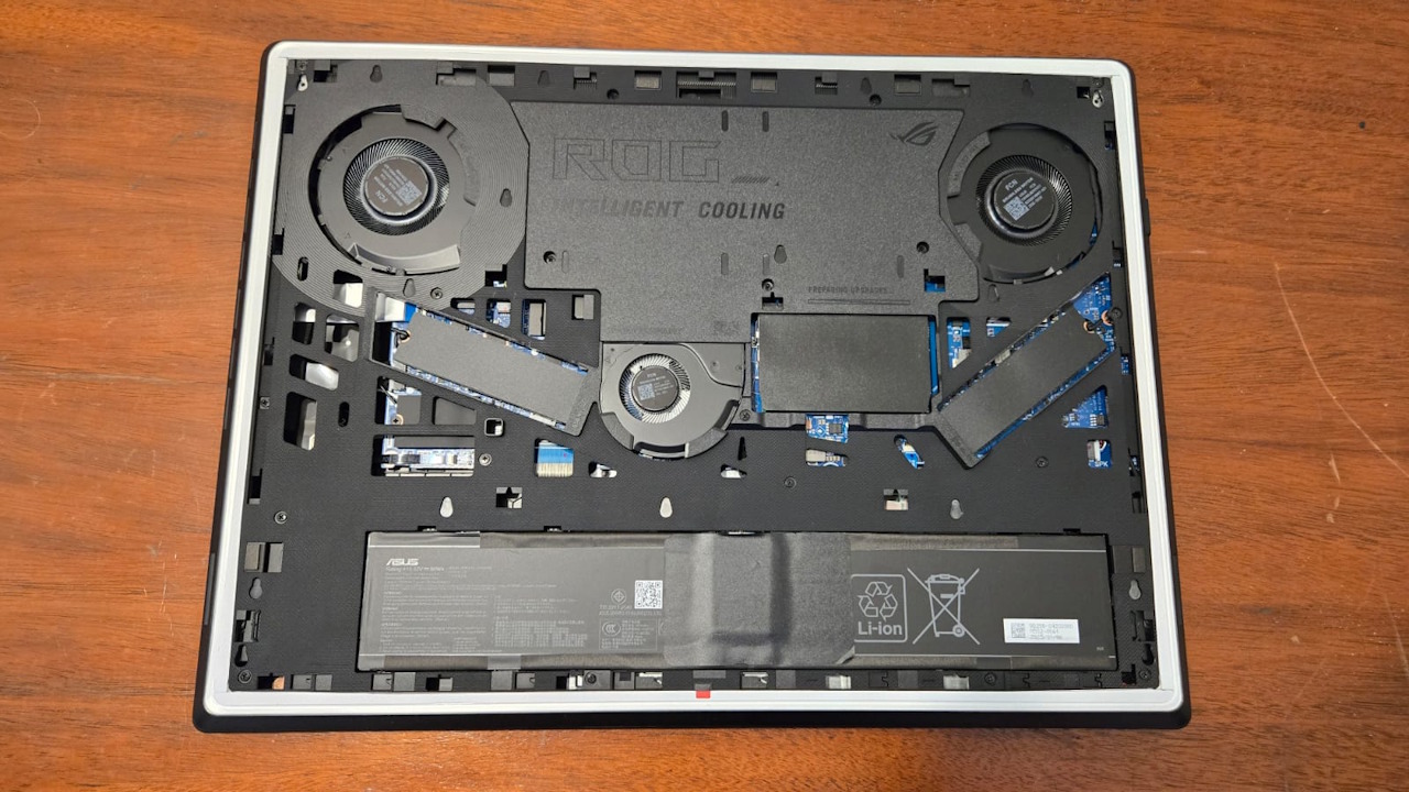 Um ponto de destaque no ROG Strix Scar 18 também está na forma de realizar upgrades. Ao invés de ter que tirar os seus parafusos, a sua parte de baixo é removida ao mover uma simples trava para o lado junto com sua tampa inferior. Assim, fica fácil mexer nos SSDs, memória ou até realizar uma limpeza em suas fans.