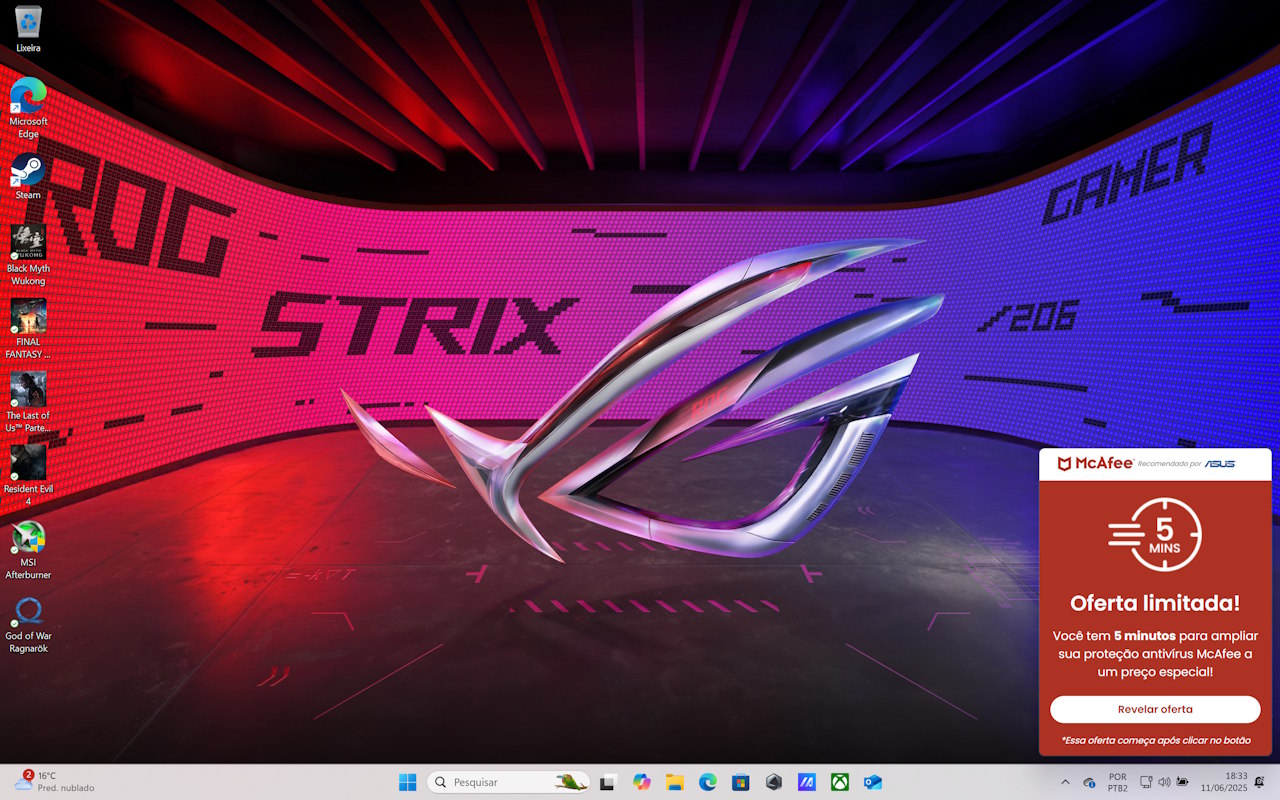 O ROG Strix Scar 18 vem com o Windows 11 pré-instalado em sua versão Home, que vem com alguns programas pré-instalados.Nesta parte, inclusive, eu deixo uma crítica para as propagandas do McAfee que surgem aleatoriamente e não somem até serem fechadas.