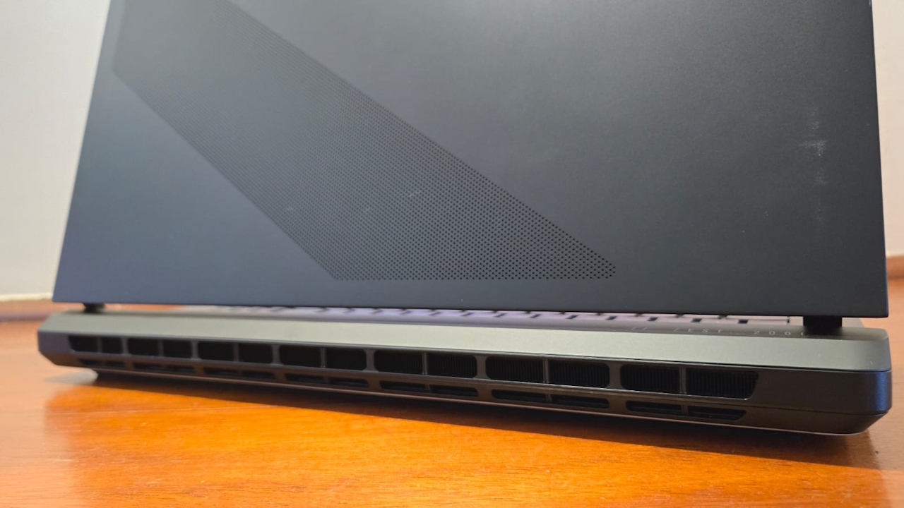 Para as saídas de ar do ROG Strix Scar 18, a ASUS adotou uma solução inteligente, que durante os meus testes se provou bem eficaz para o calor gerado não me incomodar. Diferentemente do que vemos em muitos modelos, o ar frio entra por baixo do notebook e o ar quente sai por trás.