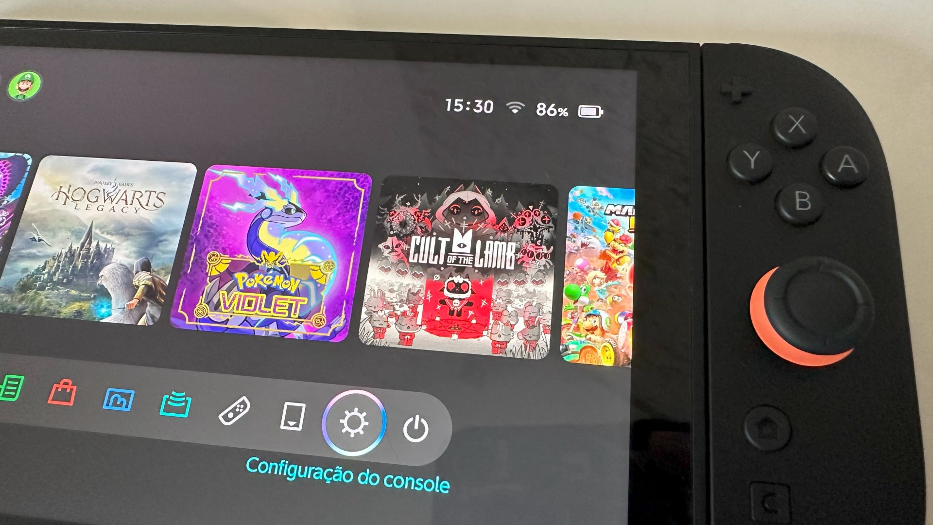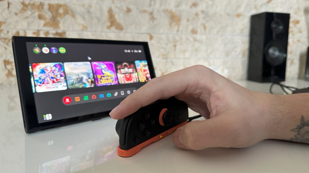 Em nossos testes, jogos pesados, como Cyberpunk 2077 e Zelda Tears of the Kingdom (na sua versão de Switch 2), e com brilho no máximo, rendeu cerca de 2 horas e 10 minutos a 2 horas e 20 minutos. Em jogos mais leves, como de Switch 1, essa estimativa é de cerca de 4 horas – enquanto indies e títulos emulados do Switch Online podem ultrapassar a marca de 5 horas.