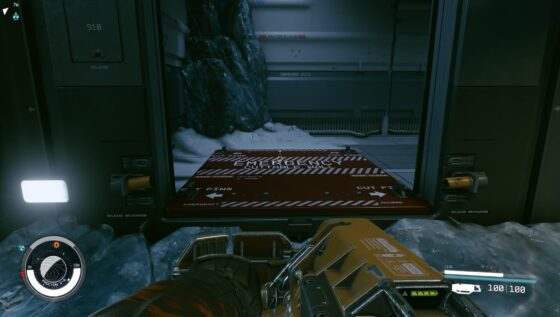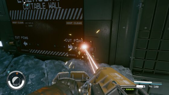 Se você notar, há quatro dobradiças que a seguram em posição: é exatamente isso que você deve mirar. Apesar de ser possível quebrá-las com tiros de qualquer arma, o método mais rápido é usando o talhador, uma arma laser capaz de garimpar minérios.