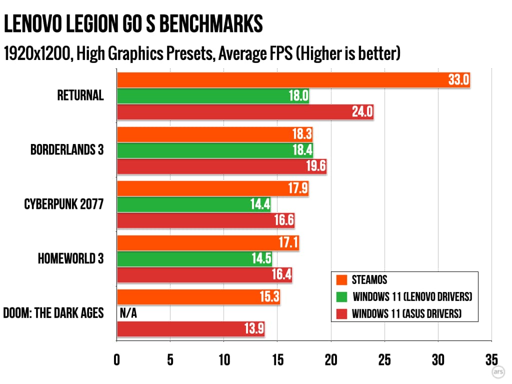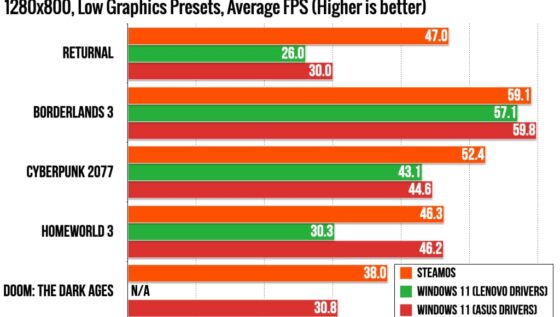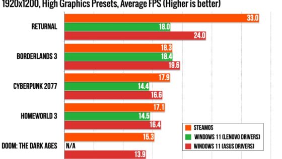 Agora, o site ArsTechnica repetiu os testes em 5 jogos diferentes, como Returnal, Borderlands 3, Doom The Dark Ages e mais. Nos testes, dois parâmetros foram colocados à prova: resolução de 1200p com gráficos no Alto e resolução de 800p com gráficos em Baixo (no lado do Windows, quando possível, os testes aconteceram com drivers da Lenovo e da Asus).