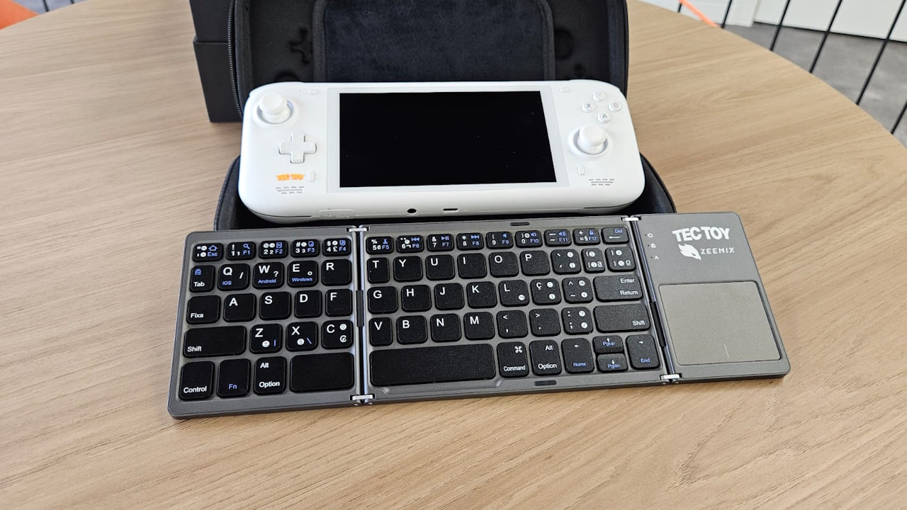 Além do estojo, como mencionado acima, aqueles que comprarem o aparelho durante a sua pré-venda também terão um miniteclado, que conta até mesmo com um trackpad. Esse miniteclado funciona apenas de forma cabeada, segundo a TecToy para garantir que ele funcione em jogos mais antigos em que o teclado virtual do Windows vira um problema.